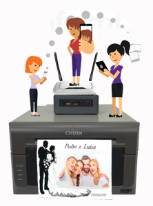 O sistema iEVENTS recebe e imprime as imagens enviadas pelos smartphones dos convidados com a máscara que foi pré-configurada.
