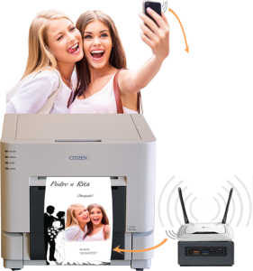 As fotos tiradas com o telemóvel podem ser impressas automaticamente com máscaras pré configuradas, sem internet e sem necessidade de um operador no evento. Tudo se processa automaticamente.