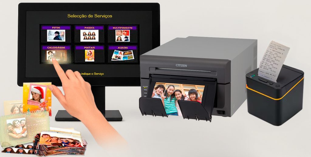 O cliente faz a seleção das fotos no kiosk, mas a impressão só arranca quando o código é inserido.